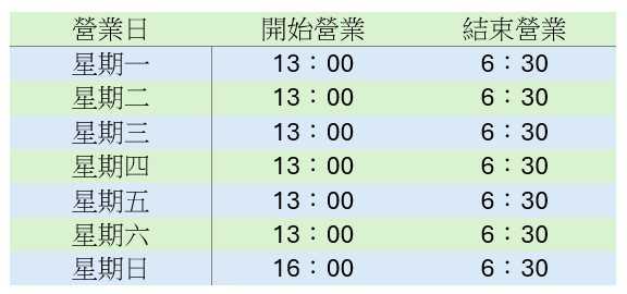 營業時間:平日一~六 下午 13:00 日下午16:00開始