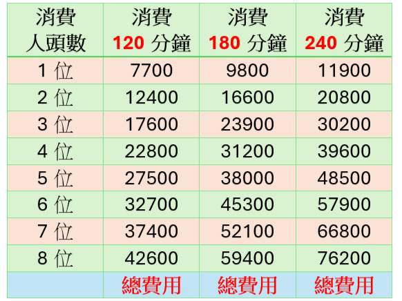 1 位客人消費 120分鐘:人均77001 (2100* 2 )+500+2000+1000 = 7700