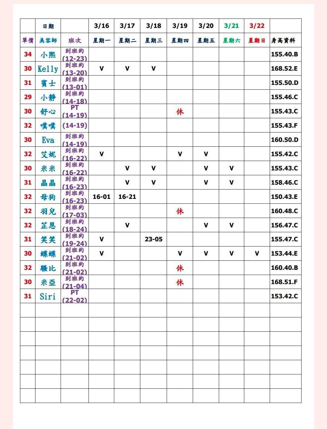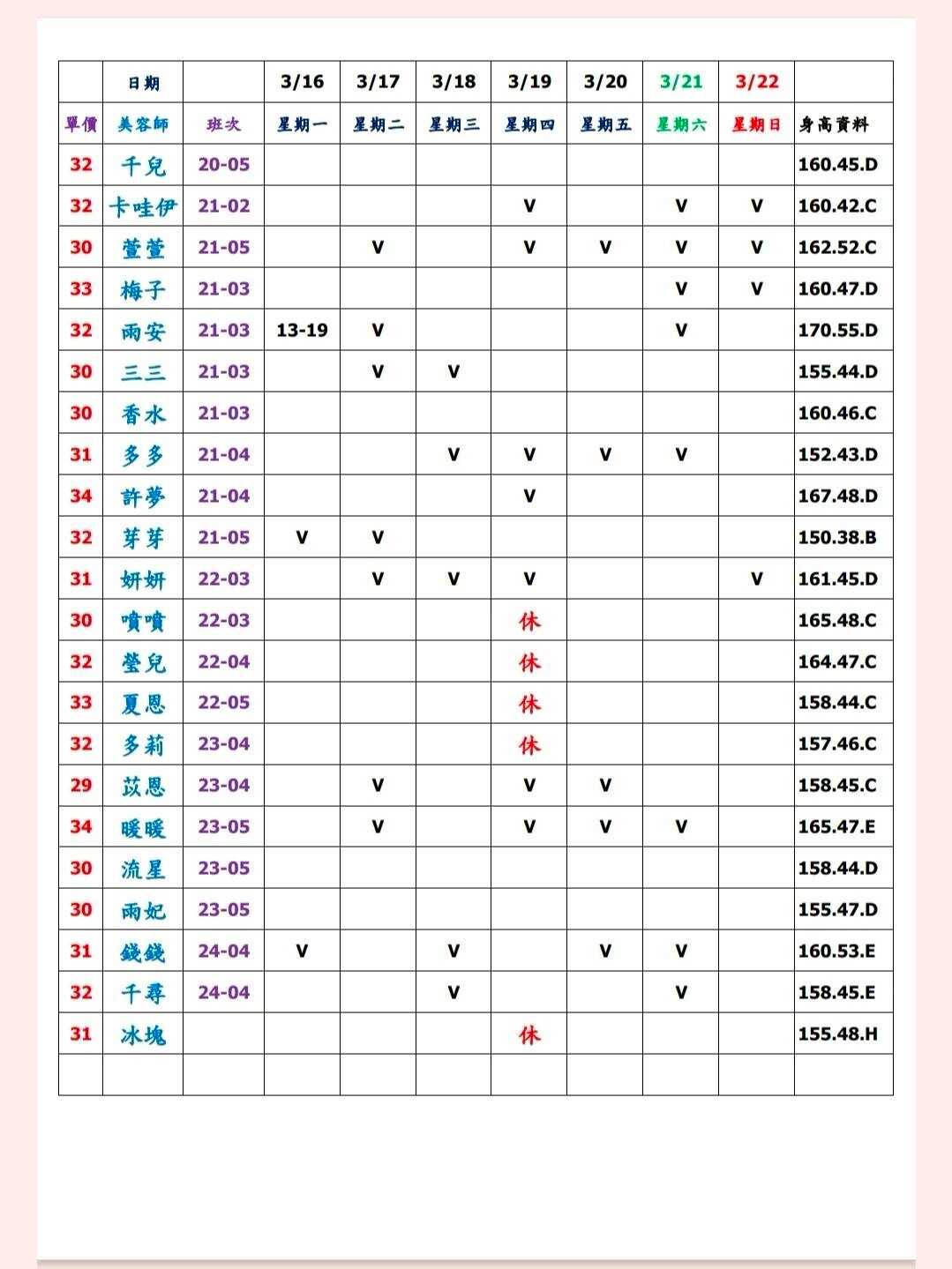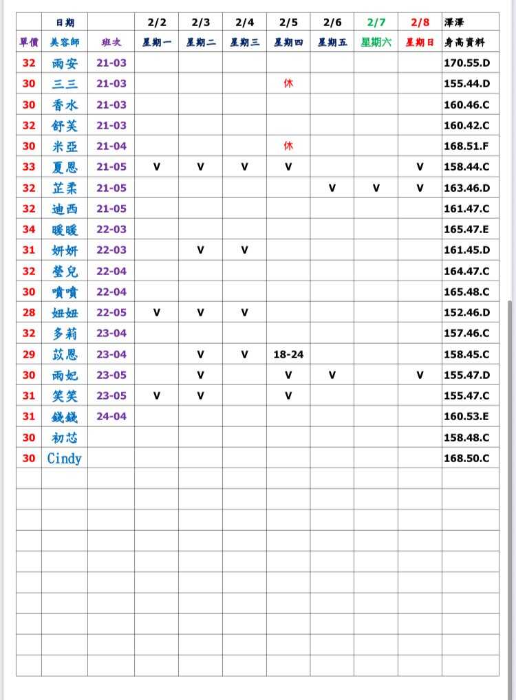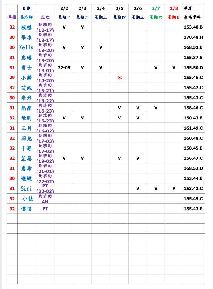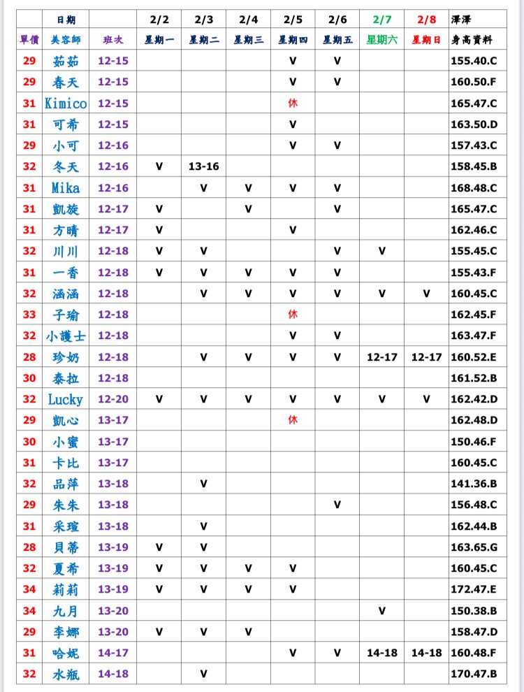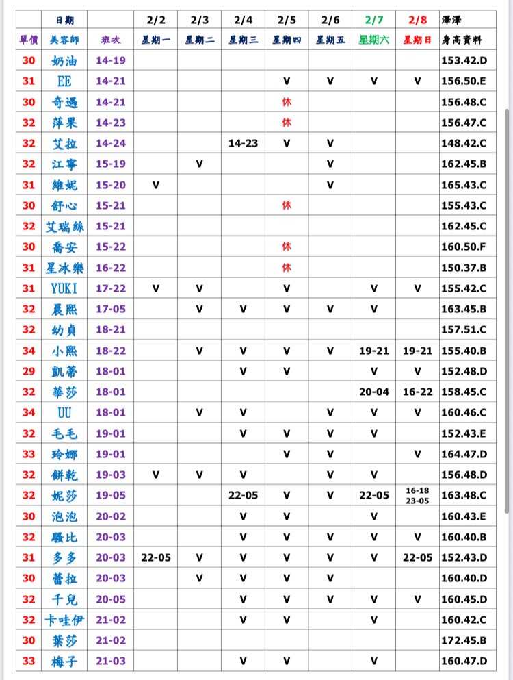 ※ 有打V為報班、時段代表當日的上班時段(不一定有空班)