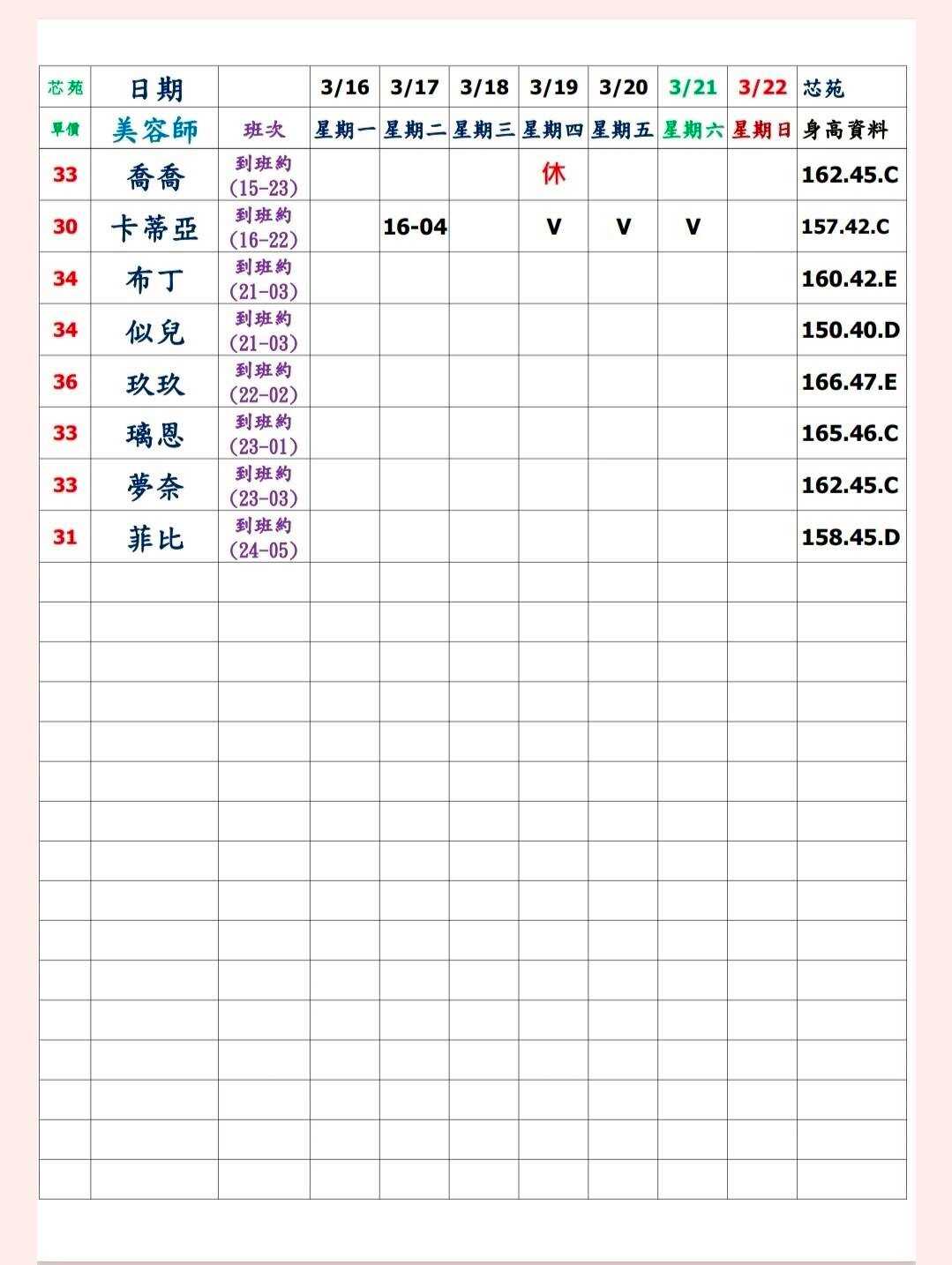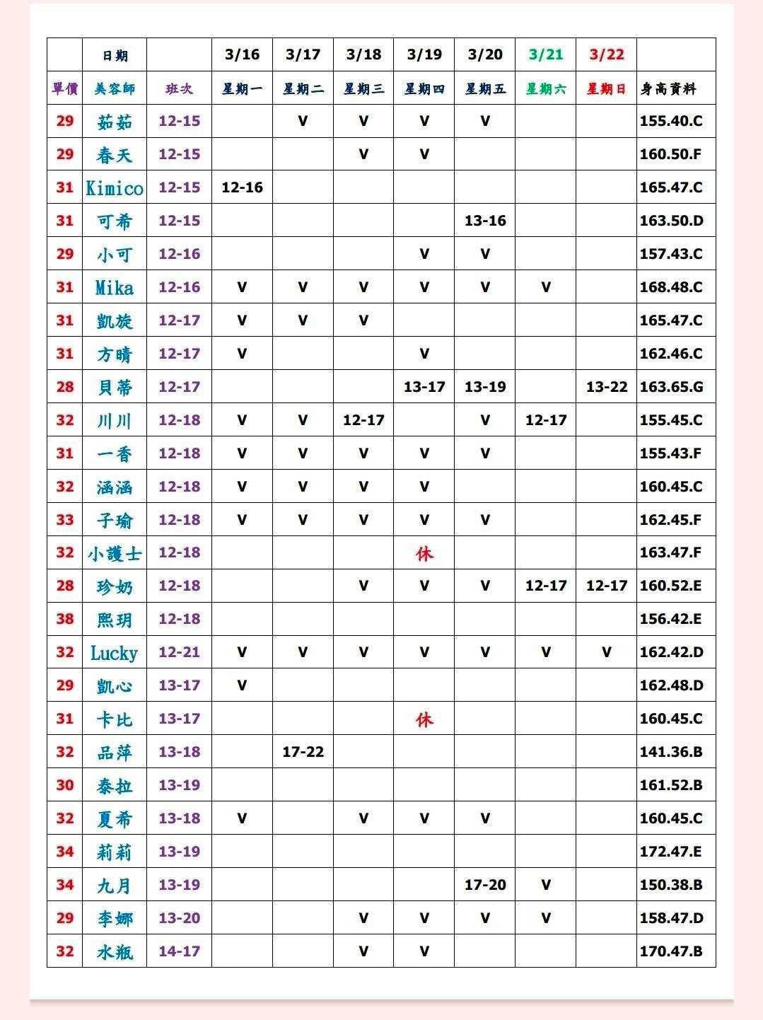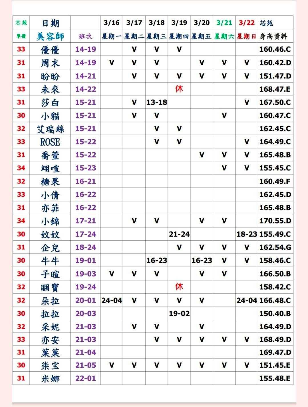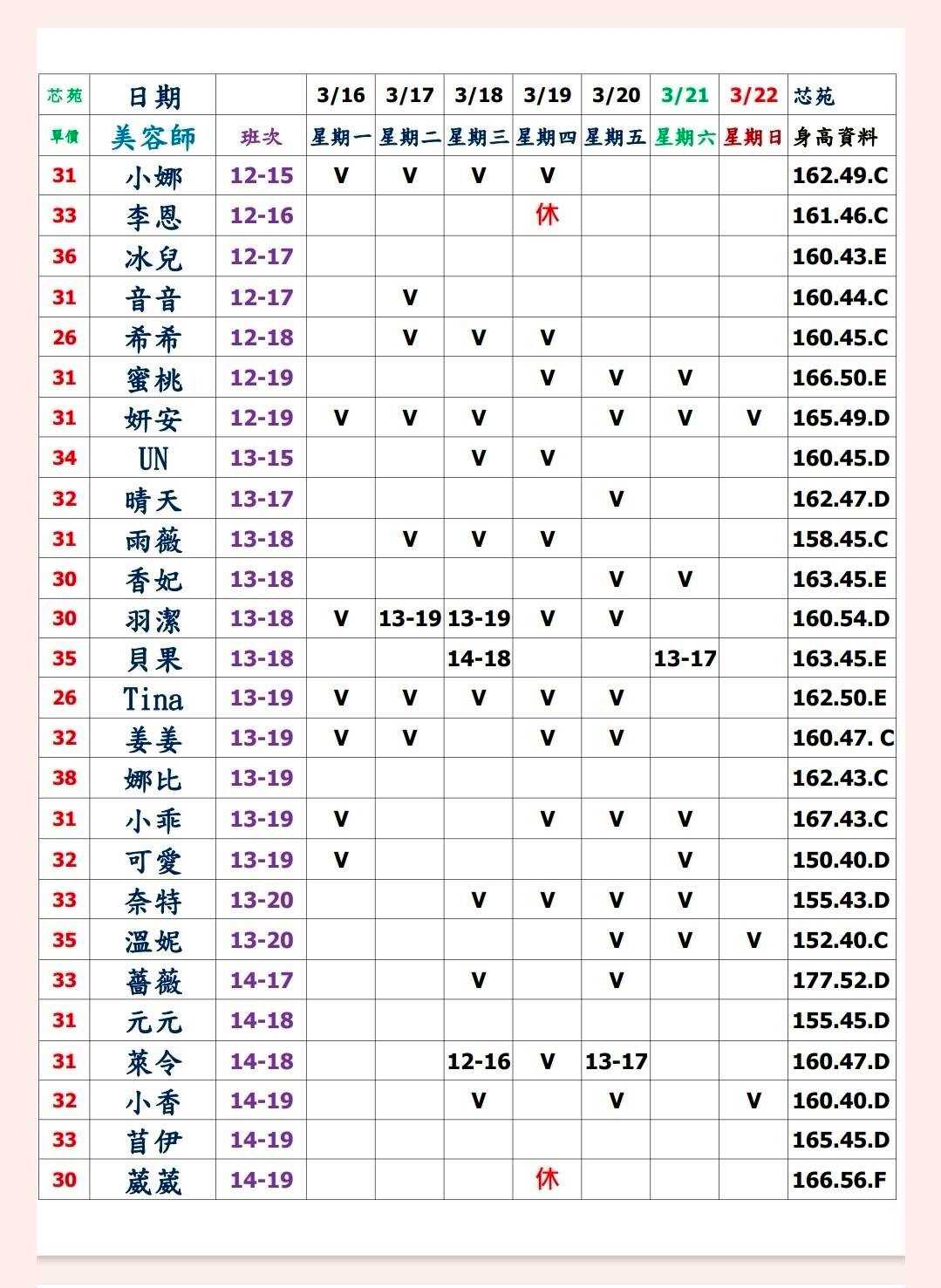 ※ 有打V為報班、時段代表當日的上班時段(不一定有空班)