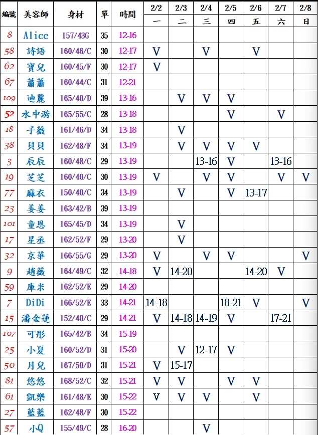 ※ 有打V為報班、時段代表當日的上班時段 (不一定有空班)
